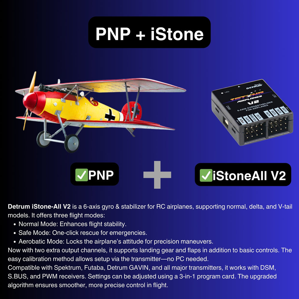 Dynam Albatros D.Va V2 er en EPO-skumreplika af denne legendariske jager fra Første Verdenskrig med et vingefang på 1,3 m, der perfekt kombinerer skaladetaljer med moderne fjernstyrede kraft. Drevet af en Detrum BM3720-650KV børsteløs motor og et 4S 2200mAh LiPo-batteri flyver dette biplan gennem luften med stor præcision. Den indbyggede iStone seks-aksede gyro holder flyvningen stabil selv i blæst, hvilket gør den ideel til piloter. Derudover skal du blot tilføje en modtager og batterier for at nyde 8-10 minutters spændende flyvetid. Denne model er perfekt til historieinteresserede eller fjernstyrede entusiaster, der ønsker en kombination af nostalgi og ydeevne.
