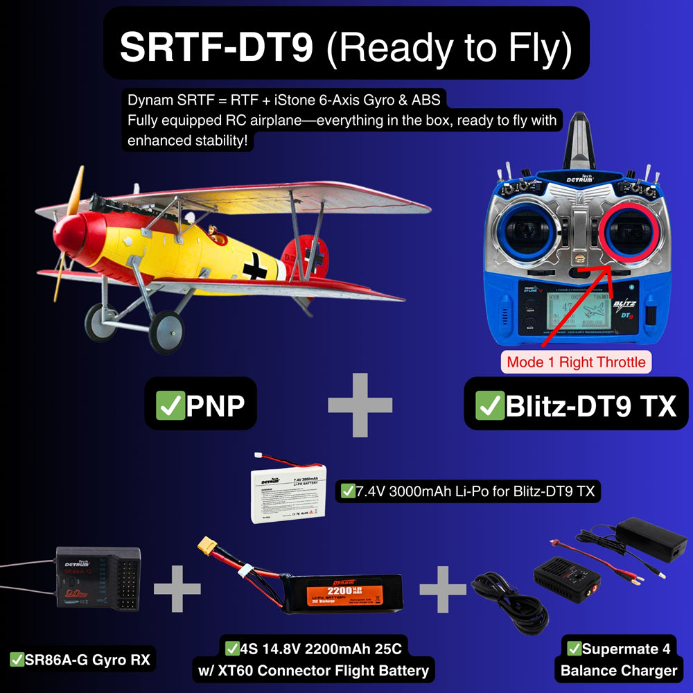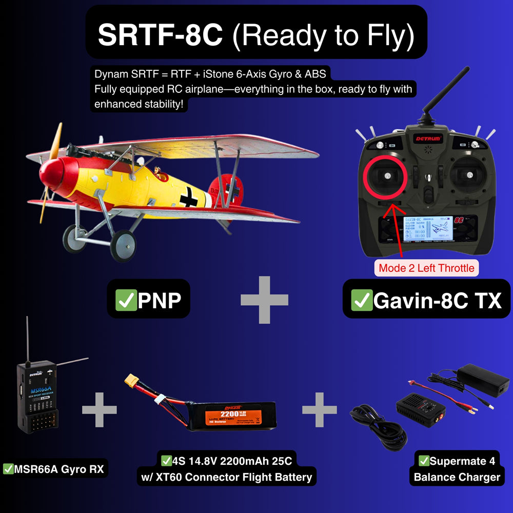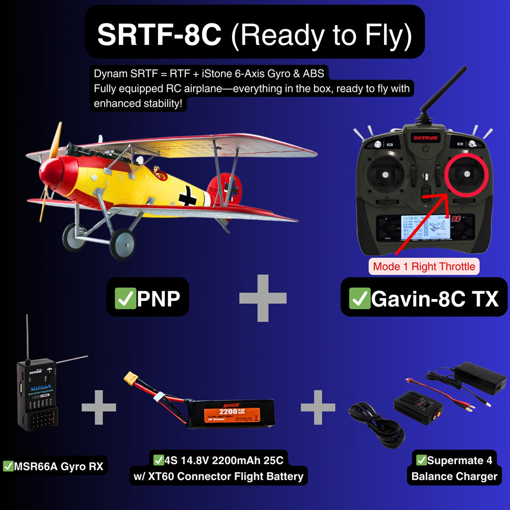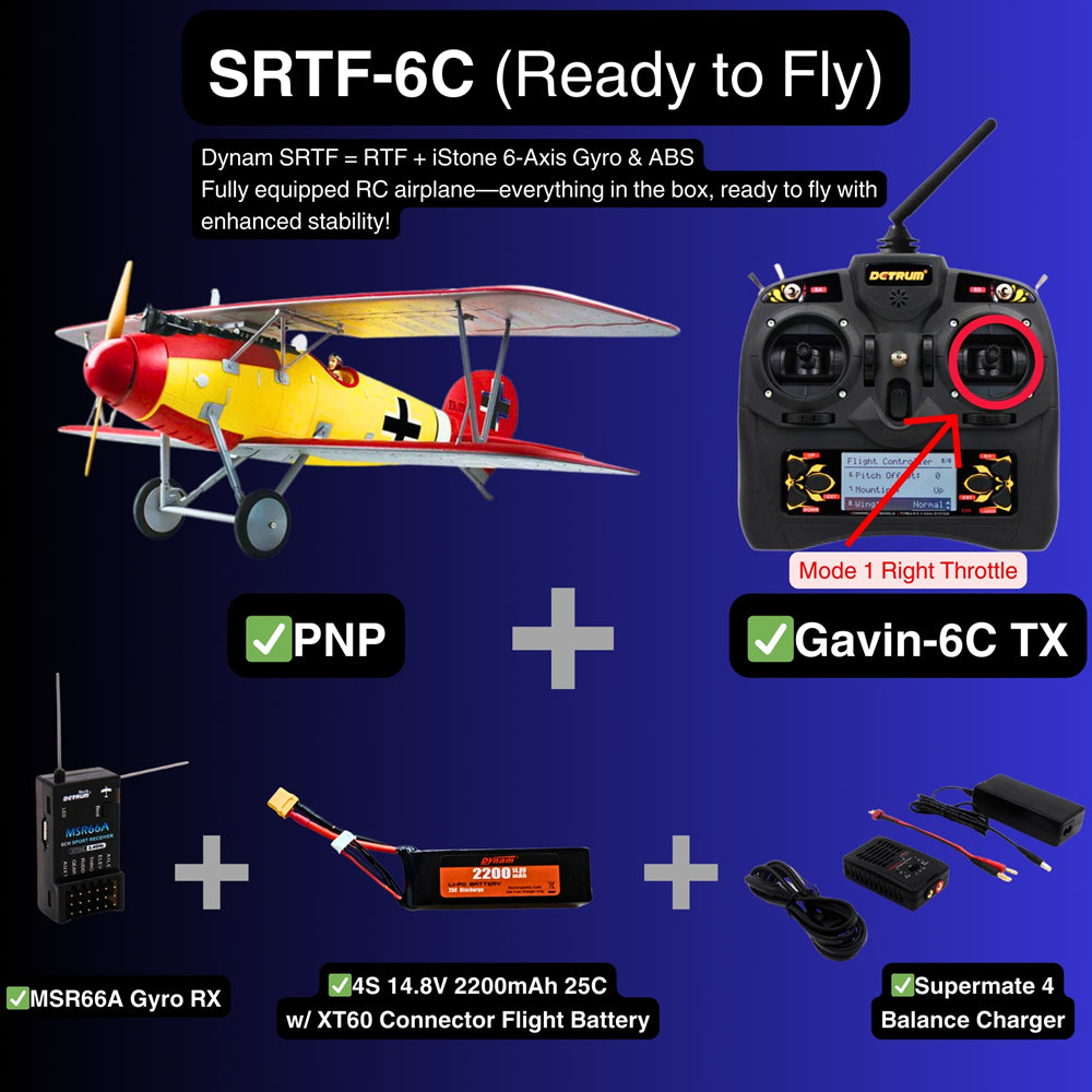 Inkluderer GAVIN 6-kanals 2,4 GHz radio , Detrum MSR66A-modtager og forudmonterede klistermærker. Tilføj blot 4S 2200mAh Li-Po batteri (XT60-stik) i 10-12 minutters flyvning.