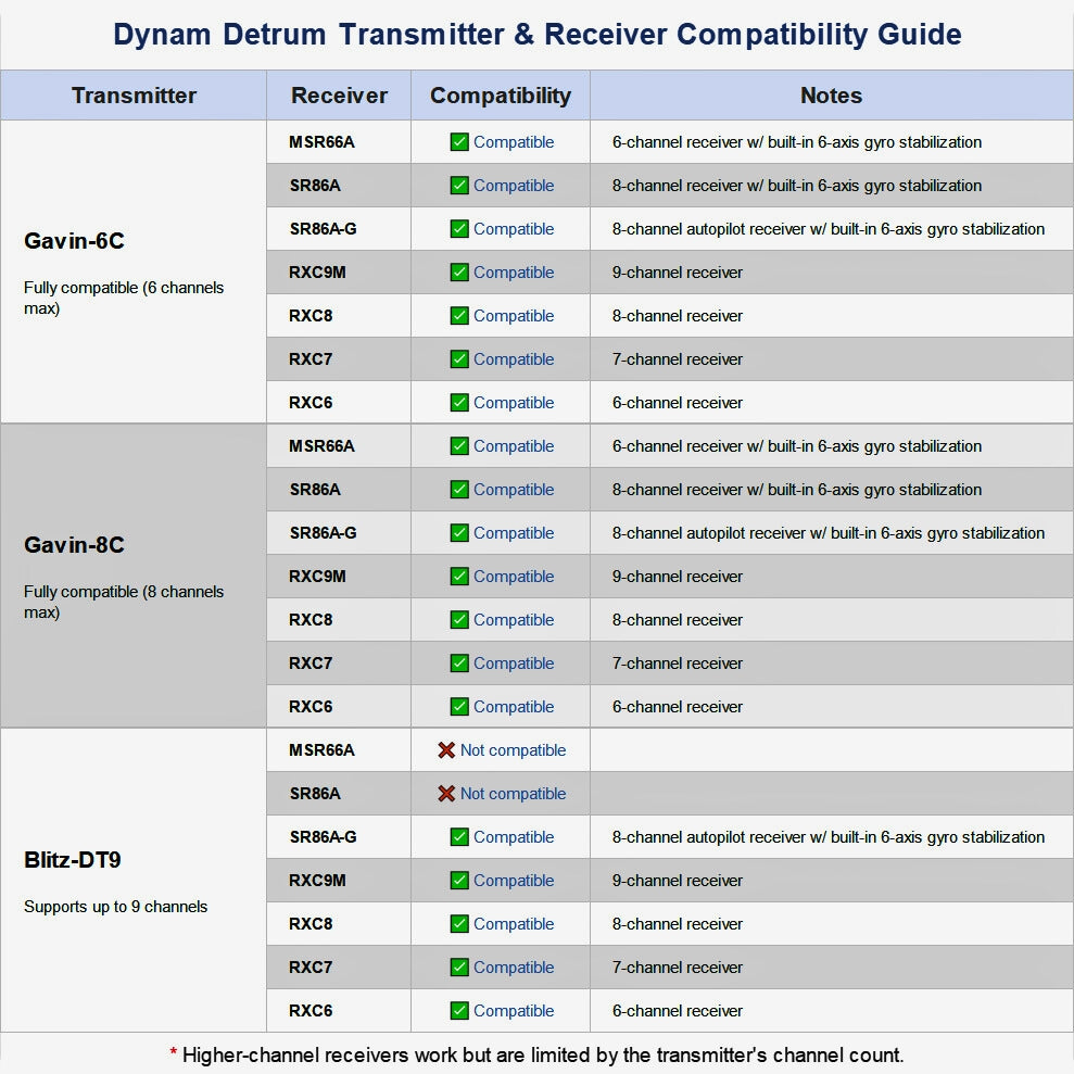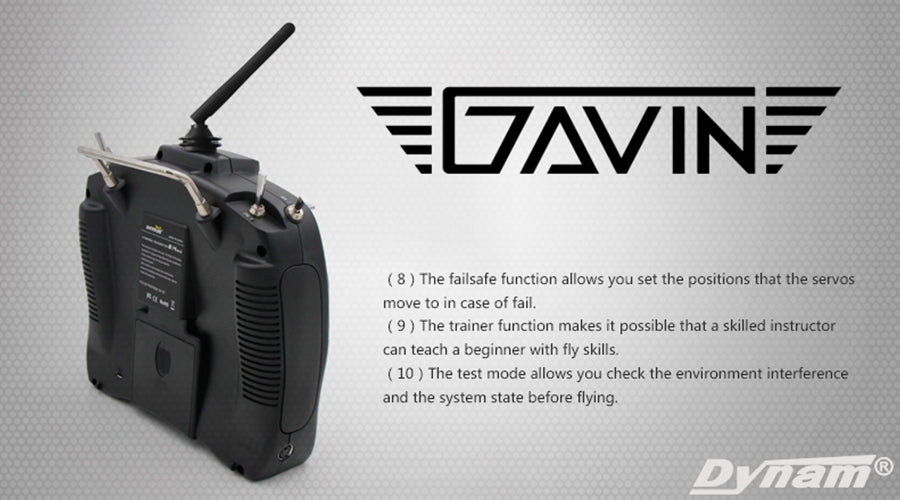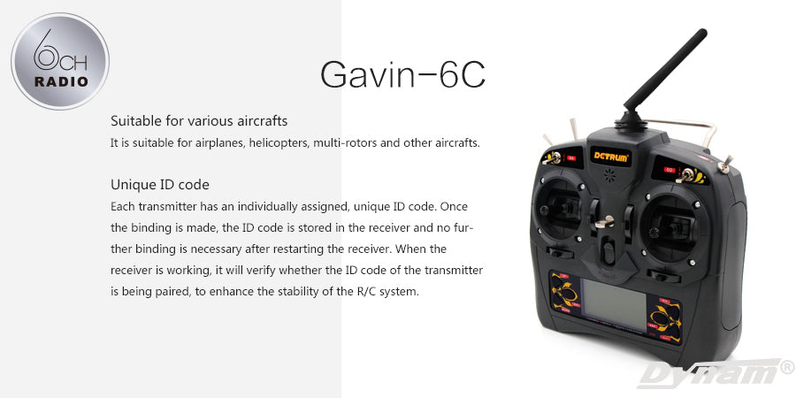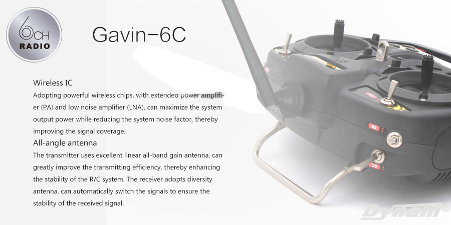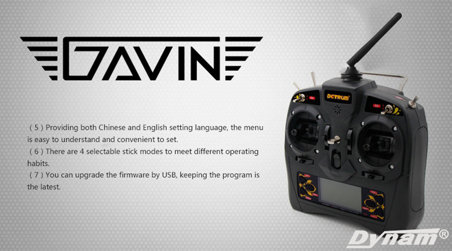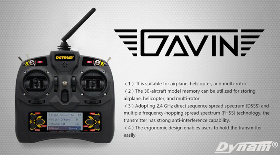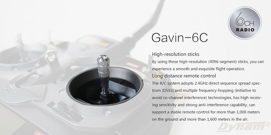 Detrum GAVIN-6C er en 2,4 GHz 6-kanals fjernbetjening til fjernstyrede fly, helikoptere og multirotorer. Den er en strømbesparende enhed med lang batterilevetid. Den understøtter fire joystick-tilstande, en træningstilstand og en sikkerhedsfunktion for øget sikkerhed og kan løbende opdateres via et USB-opgraderingsprogram. Derudover bruger fjernbetjeningen DSSS- og FHSS dual spread spectrum-teknologi, som har god signalstabilitet og anti-interferensfunktioner, selv i byområder.