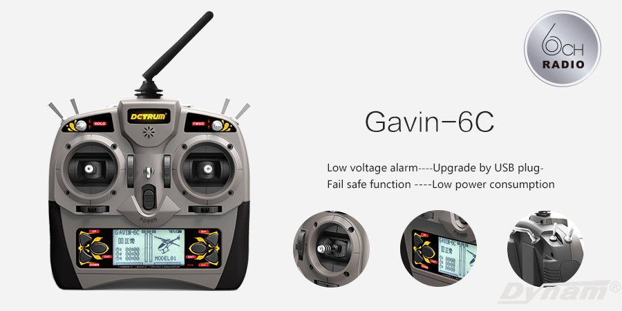 Detrum GAVIN-6C er en 2,4 GHz 6-kanals fjernbetjening til fjernstyrede fly, helikoptere og multirotorer. Den er en strømbesparende enhed med lang batterilevetid. Den understøtter fire joystick-tilstande, en træningstilstand og en sikkerhedsfunktion for øget sikkerhed og kan løbende opdateres via et USB-opgraderingsprogram. Derudover bruger fjernbetjeningen DSSS- og FHSS dual spread spectrum-teknologi, som har god signalstabilitet og anti-interferensfunktioner, selv i byområder.