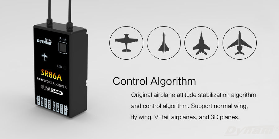 SR86A er en 8-kanals 2,4 GHz-modtager med en indbygget 6-akset gyro til konventionel vinge, flyvende vinge, V-hale og 3D-fly. Den tilbyder fire flyvetilstande: gyro slukket, normal flyvning, akrobatisk flyvning og automatisk genoprettelse, og understøtter nem programmering via kompatible fjernbetjeninger. Den bruger en 32-bit processor, DSSS/FHSS-teknologi og dobbelte antenner, med stabile signaler, stærk anti-interferensevne og automatisk fejlsikker funktion. Derudover kan ID-koden for hver fjernbetjening gemmes i modtageren, og der er ikke behov for at genindsætte efter genstart af modtageren.