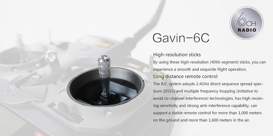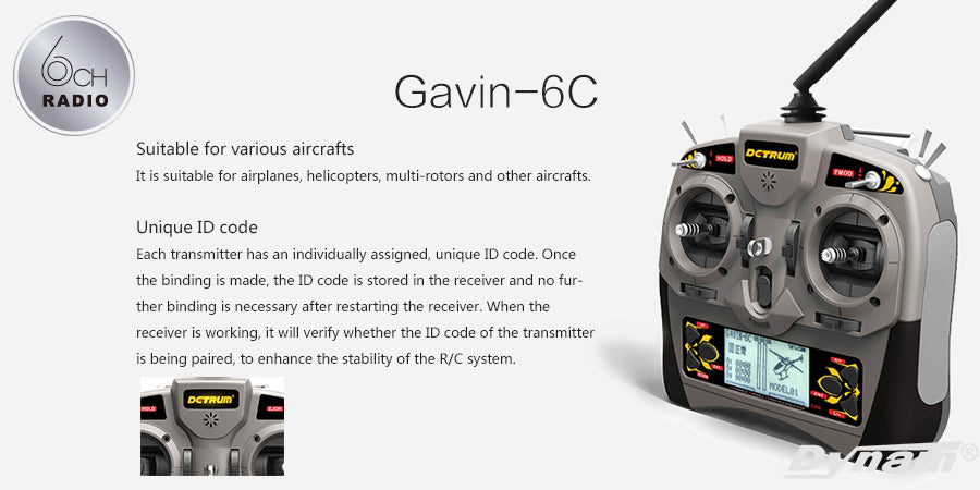 Detrum GAVIN-6C er en 6-kanals 2,4 GHz fjernstyret sender designet til fly med faste vinger, helikoptere og multirotorer. Den har fire joystick-tilstande og inkluderer en træningstilstand og en sikkerhedsfunktion for forbedret sikkerhed. Derudover anvender fjernbetjeningen mange opgraderede designs, såsom: lavt strømforbrugsdesign for at forlænge batterilevetiden, USB-opgraderingsfunktion gør det nemt at indstille programmerbare flyvecontrollerindstillinger.