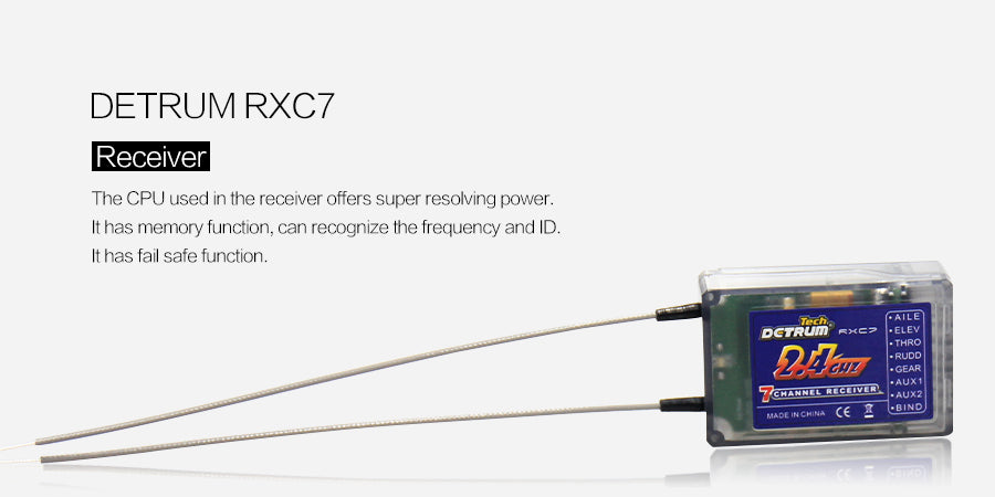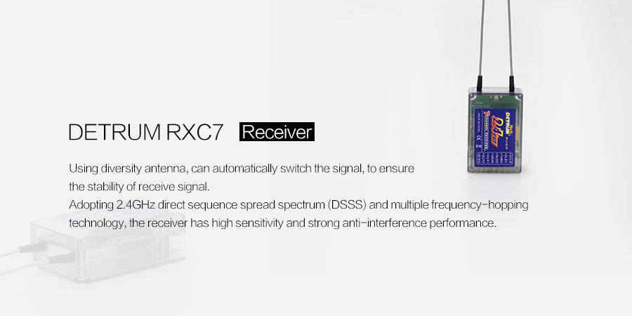 Når den bruges sammen med RXC7-modtageren, bruger den DSSS- og FHSS-teknologi med dobbelt spread spectrum til at forbedre signalstabilitet og anti-interferensevne, selv i bymiljøer, og den fungerer dermed bedre. RXC7 har også en hukommelsesfunktion, frekvensgenkendelse og et fejlsikkert system for at sikre dens sikkerhed.