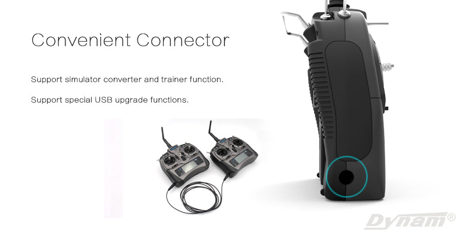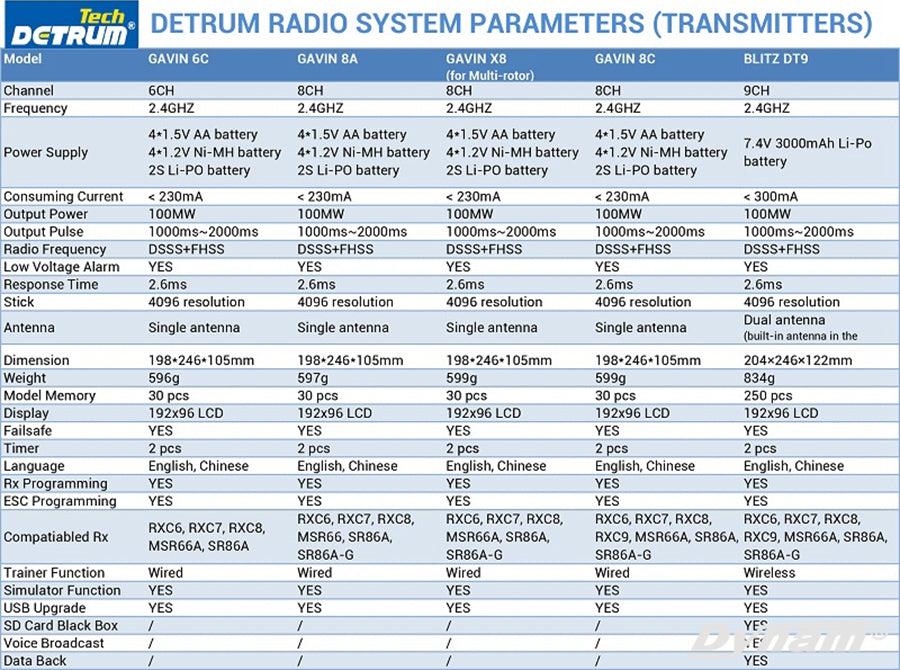 Detrum GAVIN-8C er en 2,4 GHz 8-kanals fjernbetjening til fjernstyrede fly, helikoptere og multirotorer. Den har en hurtigere responstid på kun 2,6 ms og er kompatibel med AA-, NiMH- og LiPo-batterier. Den bruger DSSS- og FHSS dual spread spectrum-teknologi til at forbedre signalstabilitet og anti-interferensevne. Derudover har den en sikkerhedsfunktion, der kan forudindstille senderens servoposition, når modtageren er ude af kontrol. Samtidig kan den bruges til at indstille programmerbare parametre til flystyring. Ikke nok med det, den har også en coaching-funktion, der gør det muligt for erfarne instruktører at guide eleverne til at mestre flyvefærdigheder.