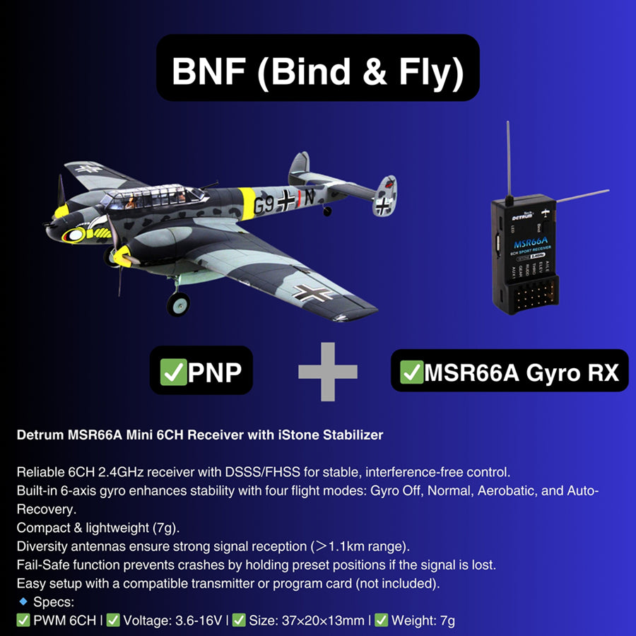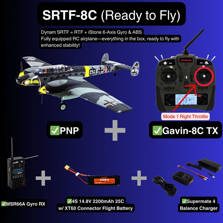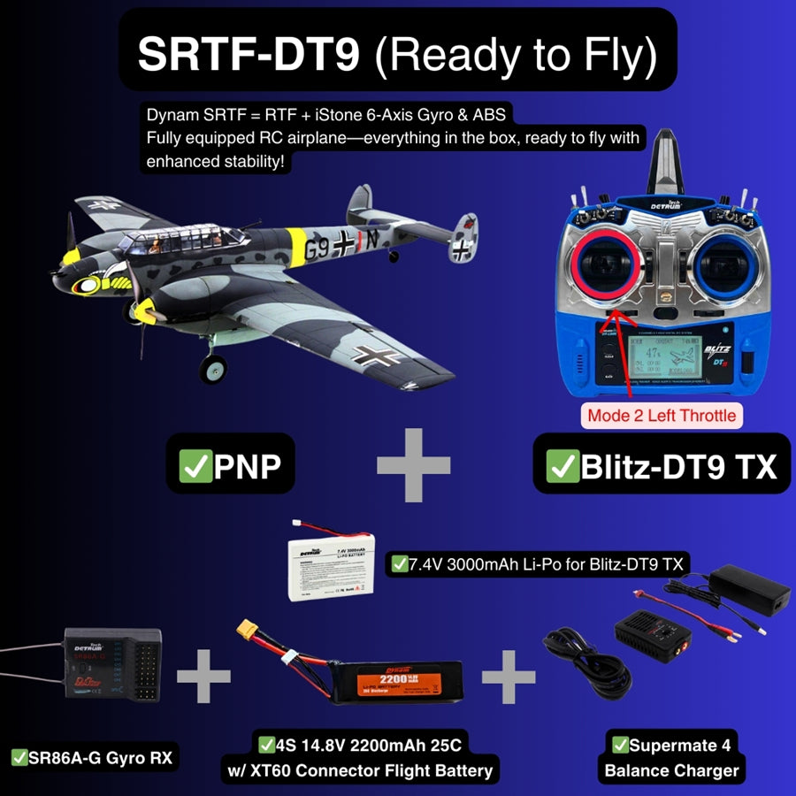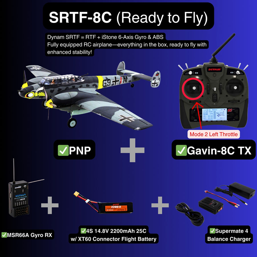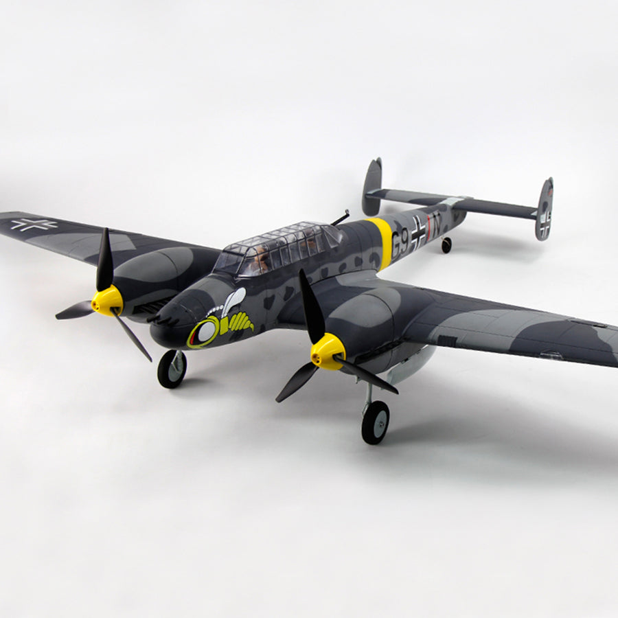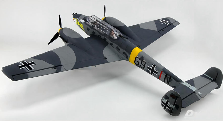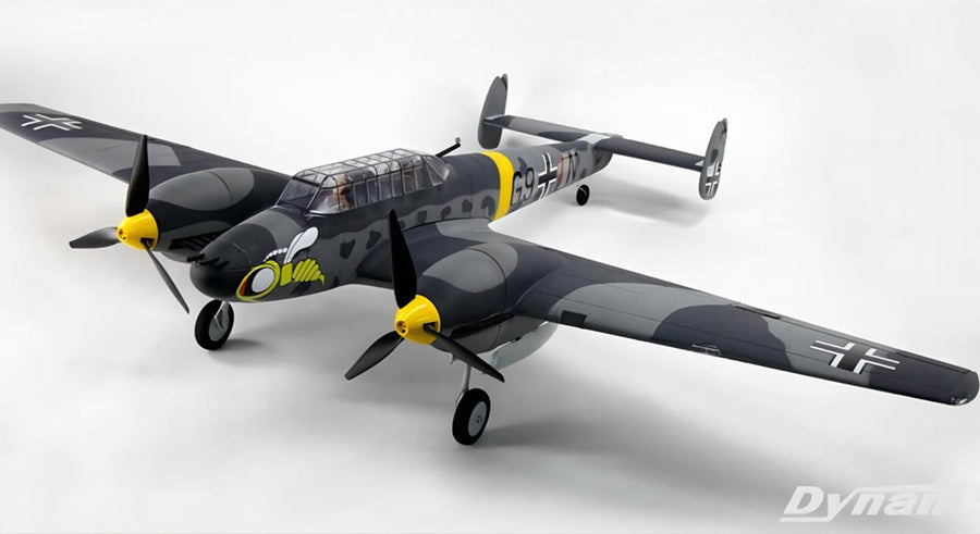 Dynams 59-tommer V3-remake leverer nu det truende udseende og mod til det 21. århundrede. Dynam Messerschmitt BF-110 RC-flyet er bygget af robust, men let EPO-skum og er let at håndtere og ideelt for piloter på mellemniveau til erfarne. Det har et vingefang på 1500 mm og en længde på 1122 mm, hvilket giver det en solid tilstedeværelse og stabilitet i luften. Det er udstyret med funktionelle flaps, elektrisk indtrækkeligt landingsudstyr, to TomCat Skylord 40A ESC'er, dobbelte Detrum BM3514-830KV børsteløse motorer og seks 9g servoer for jævn og responsiv kontrol.