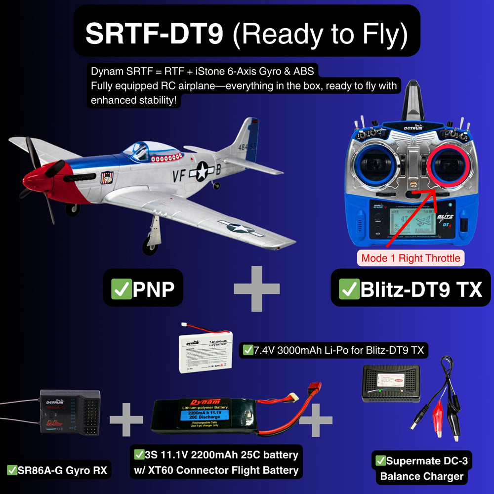 Dynam SRTF-versionen er baseret på standarden RTF (Ready to Fly), som integrerer iStone 6-Axis Gyro Stabilizer med ABS-system: RC-fly får alt i en kasse for at flyve. Radiosystemet (sender og modtager), batteripakke (batteri og oplader) og alle andre nødvendige elektriske dele er inkluderet og præinstalleret. Den indeholder modelbyggesæt, Detrum-motorer, TomCat Skylord ESC'er, servoer, Detrum-sendere, iStone gyro-modtagere, batteri, oplader og adapter. RTF-fly er en fantastisk måde at nyde spændingen ved at flyve uden for meget besvær.