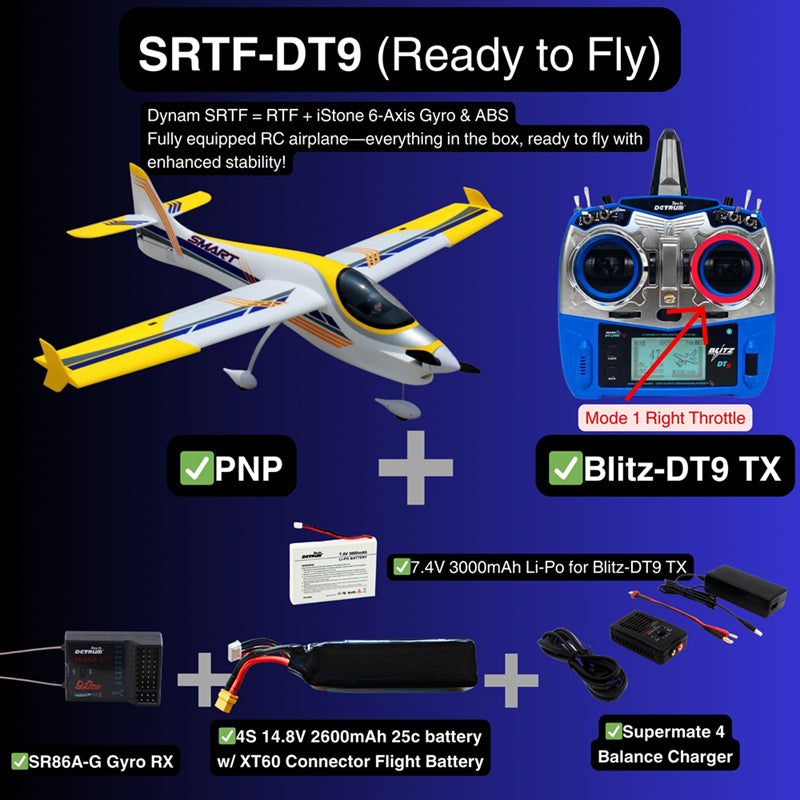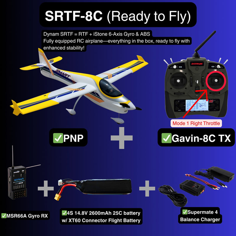 Dynam SRTF-versionen er baseret på standarden RTF (Ready to Fly), som integrerer iStone 6-Axis Gyro Stabilizer med ABS-system: RC-fly får alt i en kasse for at flyve. Radiosystemet (sender og modtager), batteripakke (batteri og oplader) og alle andre nødvendige elektriske dele er inkluderet og præinstalleret. Den indeholder modelbyggesæt, Detrum-motorer, TomCat Skylord ESC'er, servoer, Detrum-sendere, iStone gyro-modtagere, batteri, oplader og adapter. RTF-fly er en fantastisk måde at nyde spændingen ved at flyve uden for meget besvær.