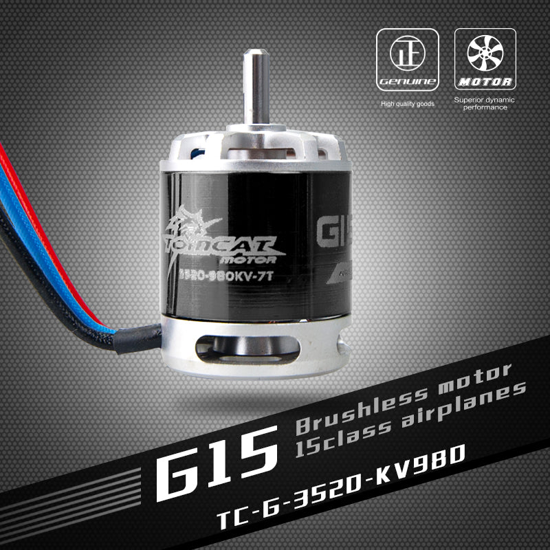 TomCat G15 3520-980KV Outrunner børsteløs motor er en effektiv og pålidelig erstatning for en 15-glødemotor. Velegnet til 3-4-cellede LiPo-batterier, kombineret med en 50 Amp ESC. Den yder 900-1200g tryk på 10"-13" propeller med 3 celler og 1200-2000g med 4 celler. Den er nominel til maks. 440 watt og har et anbefalet maksimalt strømforbrug på 32 ampere (43 ampere burst).