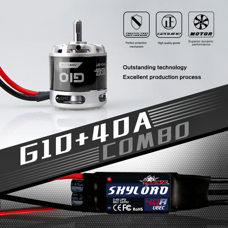 Denne kraftkombination har Skylord 40A ESC 5V/5A BEC og TomCat TC-G-3514-KV1150 (G10) børsteløs motor, der leverer robust kraft, præcis kontrol og hurtig respons. Dens avancerede design sikrer overlegen ydeevne og innovativ teknologi for en forbedret RC-oplevelse.