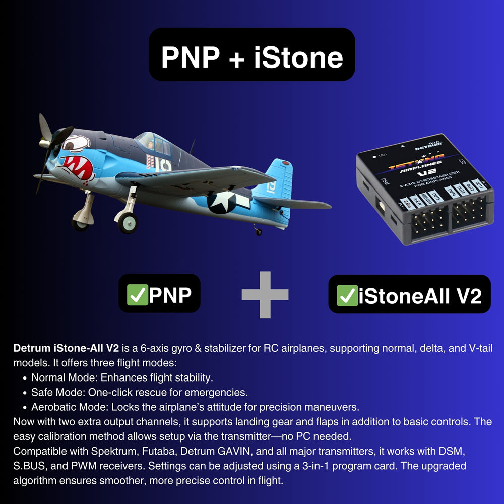 Dynam SPNP (PNP + iStone All V2) RC-flyet er et alsidigt og brugervenligt fly designet til RC-entusiaster. Ved at kombinere en nem plug-and-play-opsætning med det avancerede iStone-stabiliseringssystem passer det til en bred vifte af piloter. PNP + iStone-versionen inkluderer iStoneAll V2 6-akset gyrostabilisator, der er kompatibel med store radiosendermærker som Futaba, Spektrum, Detrum osv., hvilket giver fremragende alsidighed og flyveevne.