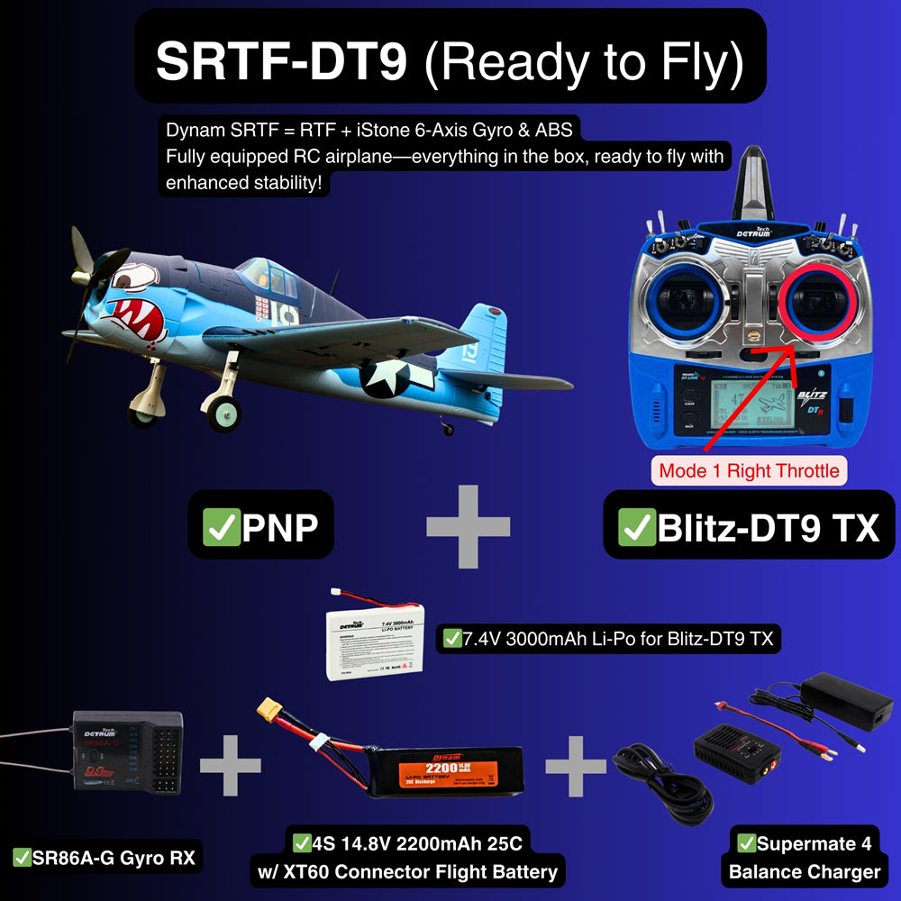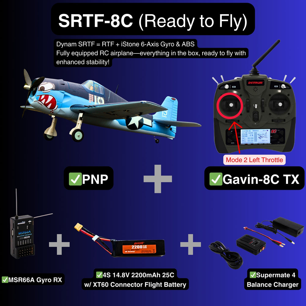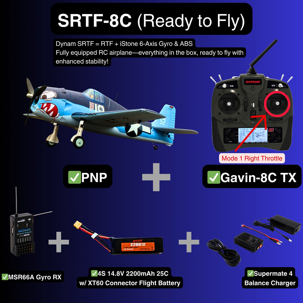Dynam SRTF-versionen er baseret på standarden RTF (Ready to Fly), som integrerer iStone 6-Axis Gyro Stabilizer med ABS-system: RC-fly får alt i en kasse for at flyve. Radiosystemet (sender og modtager), batteripakke (batteri og oplader) og alle andre nødvendige elektriske dele er inkluderet og præinstalleret. Den indeholder modelbyggesæt, Detrum-motorer, TomCat Skylord ESC'er, servoer, Detrum-sendere, iStone gyro-modtagere, batteri, oplader og adapter. RTF-fly er en fantastisk måde at nyde spændingen ved at flyve uden for meget besvær.
