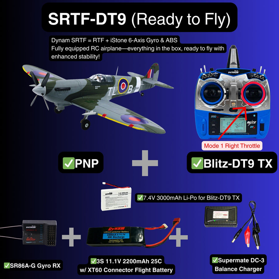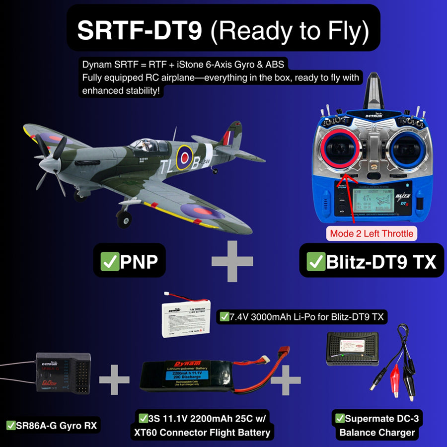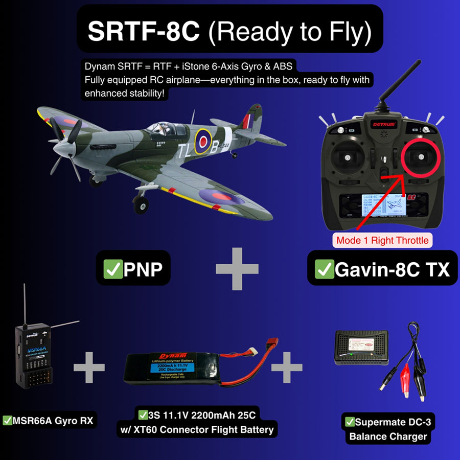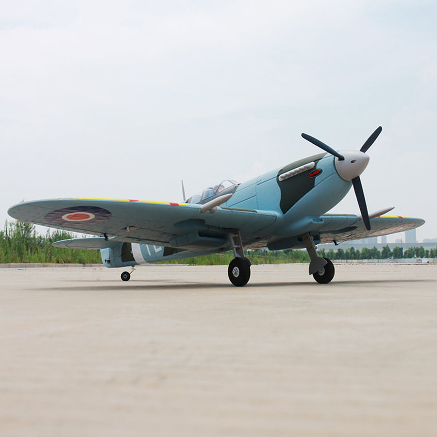 Dynam's 47" Spitfire V3 is a precision-engineered RC replica that blends historic charm with modern performance to give you the beauty of the Supermarine Spitfire. Made from sturdy EPO foam, this 1200mm wingspan fighter features an upgraded four-blade propeller and Skylord 40A ESC for smooth throttle control, perfect for iconic low-level flights or vertical climbs. The retractable landing gear makes it easy to maneuver on grass runways, while the Detrum 890KV brushless motor delivers Rolls-Royce-level power from 3S/4S batteries. Pre-installed flaps and 6-channel compatibility let you land like an experienced RAF pilot. Whether you're recreating aerial dogfights or pushing the limits of aerobatics, this PNP will give you the best experience.